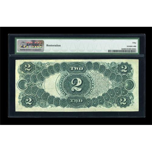 <B>Fr. 52 $2 1880 Legal Tender PMG About Uncirculated 50.</B></I> PMG has noted "Restoration" on their holder. The restoration is hard to see, but it appears that a stain of some sort was masked out along the top margin on the back. A rather good-looking piece nonetheless.<BR><BR><b>Shipping:</b> Coins & Currency (<a target="_blank" href="http://www.heritageauctions.com/common/shipping.php">view shipping information</a>)