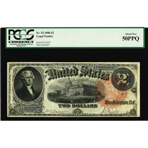 <B>Fr. 53 $2 1880 Legal Tender PCGS About New 50PPQ.</B></I> This most appealing note was part of our FUN Signature Auction earlier this year where it was described, "Two light vertical folds away from the Choice New grade. Fr. 53 is a rare one-number type, the only Deuce with the Large Red Spiked Seal. It's represented in the census by only about three dozen pieces, most of which are quite heavily circulated. Only nine of those notes are listed in Martin Gengerke's United States Paper Money Records as uncirculated. One of the notes that Gengerke lists as uncirculated is this lovely two-fold XF."<BR><I>From The Jeffrey L. Olyan Collection, Part 1</B></I>