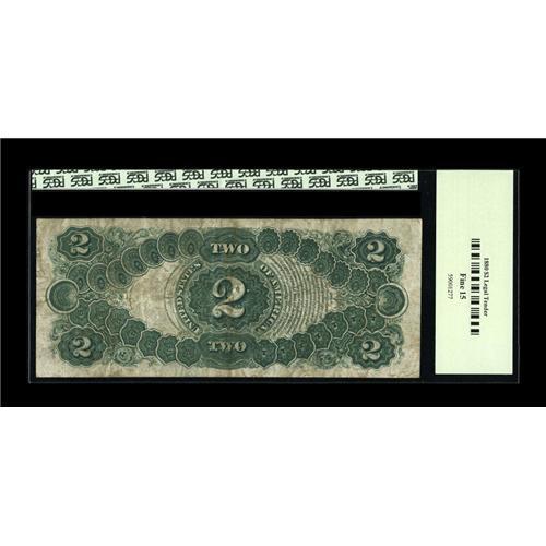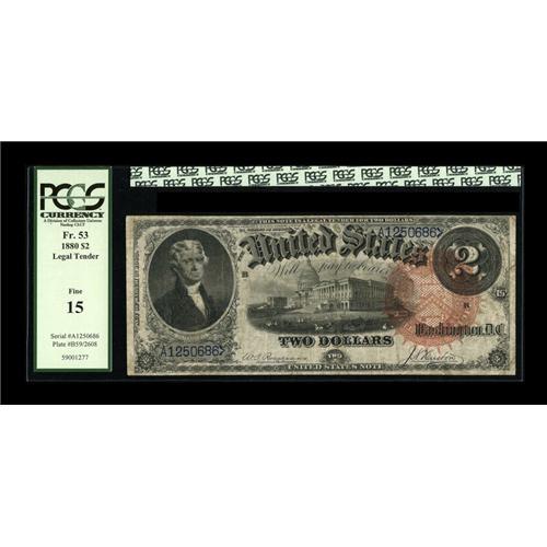 <B>Fr. 53 $2 1880 Legal Tender PCGS Fine 15.</B></I> Right around three dozen examples of this Friedberg number are known, and it represents a one number type. The large red seal is still bright and the paper solid and problem free.<BR><BR><b>Shipping:</b> Coins & Currency (<a target="_blank" href="http://www.heritageauctions.com/common/shipping.php">view shipping information</a>)