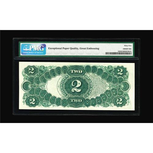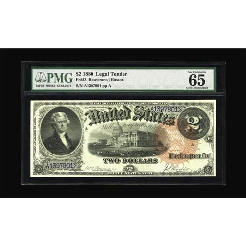 <B>Fr. 53 $2 1880 Legal Tender PMG Gem Uncirculated 65 EPQ.</B></I> A very rare one-number type with a total count in all grades combined only in the mid-thirties. This piece is listed in the census and has been tightly held for over a decade. It is one of only five collectible uncirculated examples known for this type as one is forever ensconced in the ANA museum. The colors and surfaces are flawless and the note would rate the Superb grade if the bottom margin, which is certainly more than adequate, were just a tiny touch broader at right.