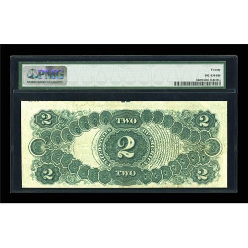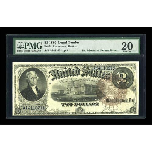 <B>Fr. 54 $2 1880 Legal Tender PMG Very Fine 20.</B></I> The Dauers have used this rare number to illustrate the Large Brown Seal Blue Serial Number type. It is the middle illustration on page 64 of their 400+ page book. Less than 20 examples are known of this rare note in all grades combined and PMG has graded only 4. While certainly well circulated, this note has remained quite clean and is free of the normal problems one would expect to find in the 20 grade. <BR><I>From The Dr. Edward & Joanne Dauer Collection</B></I><BR><BR><b>Shipping:</b> Coins & Currency (<a target="_blank" href="http://www.heritageauctions.com/common/shipping.php">view shipping information</a>)