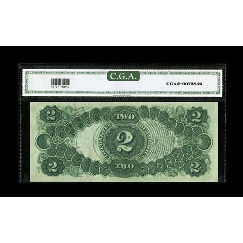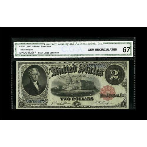 <B>Fr. 56 $2 1880 Legal Tender CGA Gem Uncirculated 67.</B></I> Even margins surround colorful paper surfaces. Certainly one of the nicer examples available.