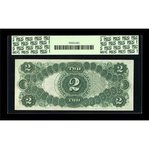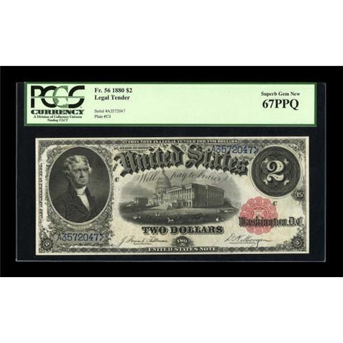 <B>Fr. 56 $2 1880 Legal Tender PCGS Superb Gem New 67PPQ.</B></I> By far the more common piece of this two-number type. PCGS has not yet issued a census, but the PMG census shows one 67, eleven 66s and eight 65s. If the proportions hold true and they likely will, it is clear that Fr. 56s at this level will always be quite rare. This attractive piece certainly seems to have qualified for its Superb level grade in every sense. <BR><BR><b>Shipping:</b> Coins & Currency (<a target="_blank" href="http://www.heritageauctions.com/common/shipping.php">view shipping information</a>)