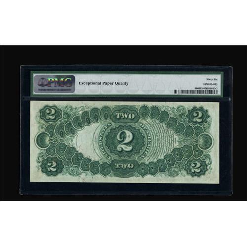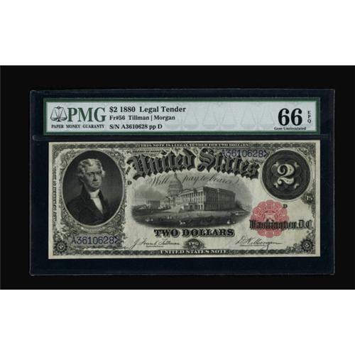 <B>Fr. 56 $2 1880 Legal Tender PMG Gem Uncirculated 66 EPQ.</B></I> A really pretty 1880 Deuce with broad margins, perfect color, and paper originality that can be easily see through the third-party holder. 66 EPQ is a high enough grade that we really should be satisfied and not questioning it, but this one looks to us that it should have been a 67.<BR><BR><b>Shipping:</b> Coins & Currency (<a target="_blank" href="http://www.heritageauctions.com/common/shipping.php">view shipping information</a>)