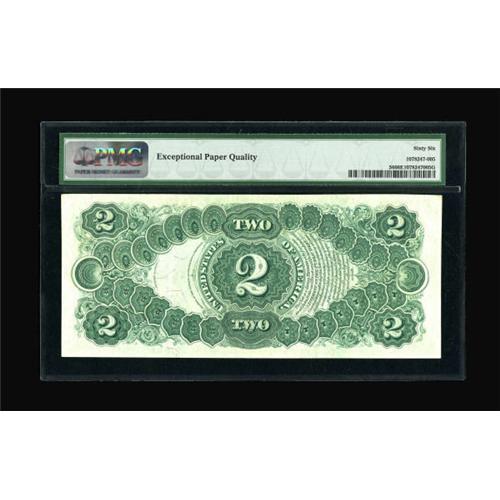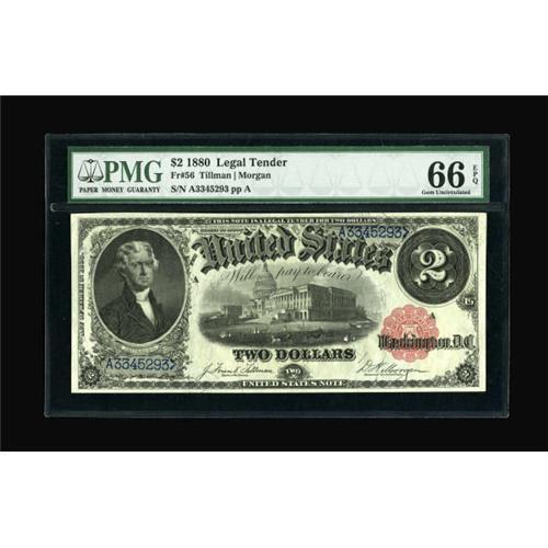 <B>Fr. 56 $2 1880 Legal Tender PMG Gem Uncirculated 66 EPQ.</B></I> A striking-looking small seal 1880 Deuce with broad margins and clearly original paper quality. Only a single note has been graded higher by PMG.<BR><I>From The John Ameen Collection</B></I><BR><BR><b>Shipping:</b> Coins & Currency (<a target="_blank" href="http://www.heritageauctions.com/common/shipping.php">view shipping information</a>)