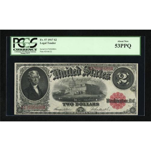 <B>Fr. 57 $2 1917 Legal Tender PCGS About New 53PPQ.</B></I> A center fold and light corner bend keep this CU looking note from a higher grade.<BR><BR><b>Shipping:</b> Coins & Currency (<a target="_blank" href="http://www.heritageauctions.com/common/shipping.php">view shipping information</a>)