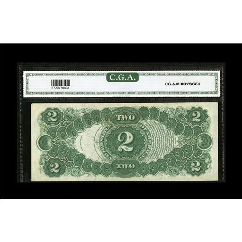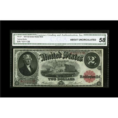 <B>Fr. 57 $2 1917 Legal Tender Star Note CGA About Uncirculated 58.</B></I> A corner tip fold is noticed on this tougher early replacement note that has some minor discoloration around the margins.