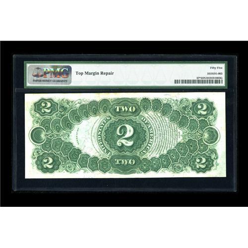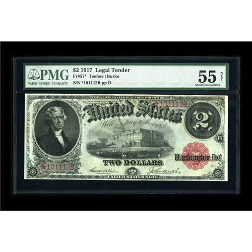 <B>Fr. 57 $2 1917 Legal Tender Star PMG Net About Uncirculated 55.</B></I> Edge repairs in the top margin keep this note from achieving a full uncirculated grade. Most of the known stars for this issue are in circulated states of preservation.<BR><BR><b>Shipping:</b> Coins & Currency (<a target="_blank" href="http://www.heritageauctions.com/common/shipping.php">view shipping information</a>)