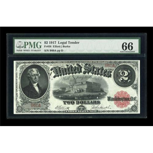 <B>Fr. 58 $2 1917 Legal Tender Low Serial Number B60A PMG Gem Uncirculated 66.</B></I> Low two digit serial number B60A is carried by this deeply inked Deuce.<BR><BR><b>Shipping:</b> Coins & Currency (<a target="_blank" href="http://www.heritageauctions.com/common/shipping.php">view shipping information</a>)