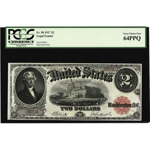 <B>Fr. 58 $2 1917 Legal Tender PCGS Very Choice New 64PPQ.</B></I> This two digit serial number 20 Fr. 58 has earned the "Premium Paper Quality" designation from PCGS. It is a bright representative of the grade which is well centered.