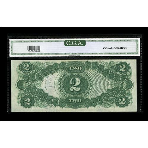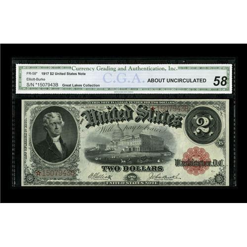 <B>Fr. 58 $2 1917 Legal Tender Star Note CGA About Uncirculated 58.</B></I> A handful more than thirty examples of this star are known and we very much like this particular piece for its bright paper and color.