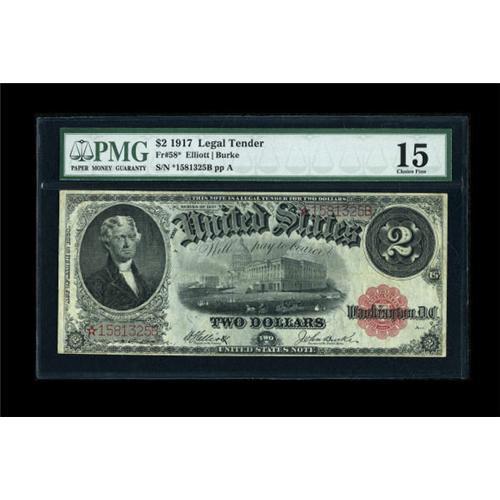 <B>Fr. 58 $2 1917 Legal Tender Star Note PMG Choice Fine 15.</B></I> Only 43 examples are enumerated in the updated Murray census. This note remains bright with plenty of eye appeal. <BR><BR><b>Shipping:</b> Coins & Currency (<a target="_blank" href="http://www.heritageauctions.com/common/shipping.php">view shipping information</a>)