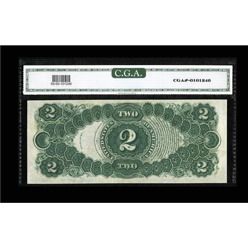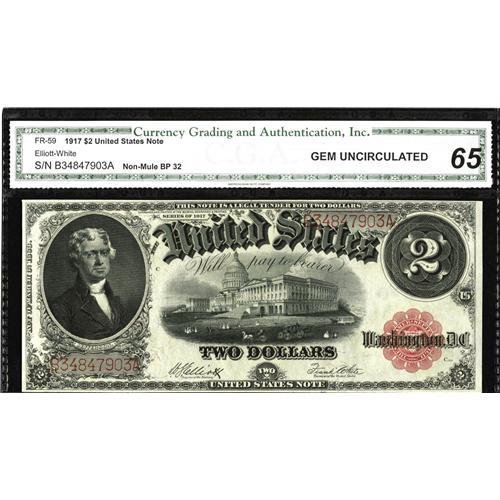 <B>Fr. 59 $2 1917 Legal Tender CGA Gem Uncirculated 65.</B></I> A little over 100 Fr. 59's are known in all grades. This bright representative is nicely centered with deep inks. The framelines remain complete all around the face.