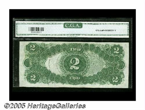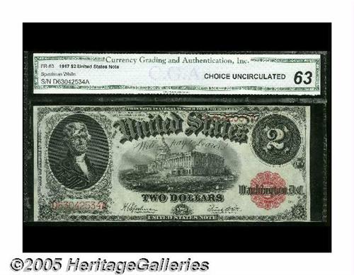 <B>Fr. 60 $2 1917 Legal Tender CGA Choice Uncirculated 63.</B></I> Tight at the top and bottom, but with lots of color.