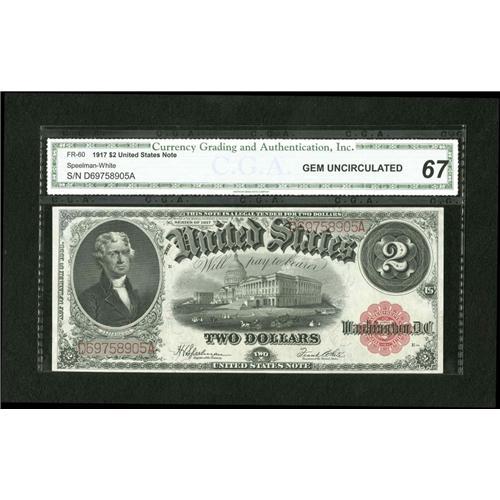 <B>Fr. 60 $2 1917 Legal Tender CGA Gem Uncirculated 67.</B></I> A very common note, but not in this grade. Very nice margins for the issue and absolutely ideal color are evident through the third party holder.