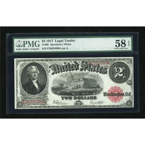 <B>Fr. 60 $2 1917 Legal Tender PMG Choice About Unc 58 EPQ.</B></I> A bright lightly handled note that is well embossed.<BR><BR><b>Shipping:</b> Coins & Currency (<a target="_blank" href="http://www.heritageauctions.com/common/shipping.php">view shipping information</a>)