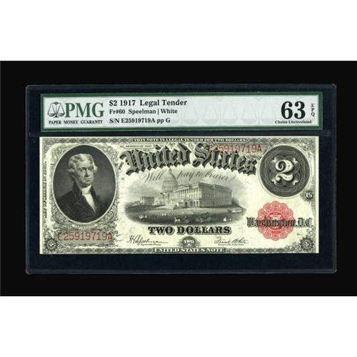 <B>Fr. 60 $2 1917 Legal Tender PMG Choice Uncirculated 63 EPQ.</B></I> The bottom margin is a bit tight for a higher grade. Overall, the eye appeal is most pleasing.<B><BR></B></I><I>From The Warren Marshall Collection</B></I><BR><BR><b>Shipping:</b> Coins & Currency (<a target="_blank" href="http://www.heritageauctions.com/common/shipping.php">view shipping information</a>)
