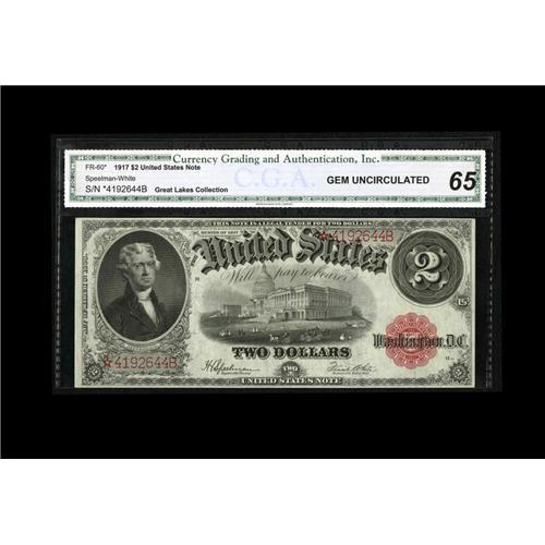 <B>Fr. 60 $2 1917 Legal Tender Star Note CGA Gem Uncirculated 65.</B></I> This high grade star example has been graded and slabbed by CGA in a Gem Uncirculated 65 holder.