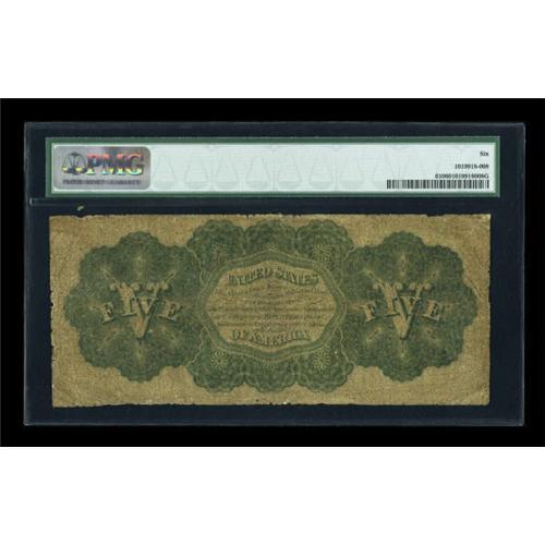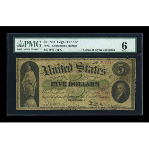 <B>Fr. 61 $5 1862 Legal Tender PMG Good 6.</B></I> Only fifteen examples of Fr. 61 are known according to the updated (2/08) Track & Price census. This "No Series" Legal Tender Note is, in effect, <I>Series 1 </B></I>of the 72 series that were printed. Notes were numbered from 1 through 100,000 and then back to 1 again. To distinguish among serial number runs, notes were marked "Series 2," "Series 3" etc., each time a new run of 100,000 was begun. However, the first run of 100,000 was not marked, hence the existence of the very rare Fr. 61. In spite of the low grade of this piece, it's a solid rather attractive example of this rarity. Only a single high-grade example of this number exists, with all others grading under 20. The vast majority of the fifteen known examples grade 6 or 8.<BR><I>From The Thomas M. Flynn Collection</B></I><BR><BR><b>Shipping:</b> Coins & Currency (<a target="_blank" href="http://www.heritageauctions.com/common/shipping.php">view shipping information</a>)
