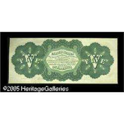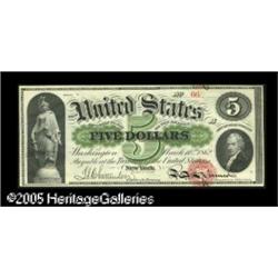 <B>Fr. 61a $5 1862 Legal Tender Choice Crisp Uncirculated.</B></I><BR> A lovely note displaying a most unusual error, as the red Treasury seal is printed at the bottom of the note rather than in its normal position above the Spinner signature. Even more interesting is that a small portion of the seal from the note above shows in this note's top margin. It's a flawless uncirculated example save for one rather clumsily filled pinhole next to the serial number. Lot:15016