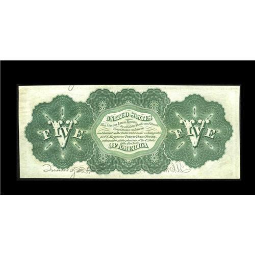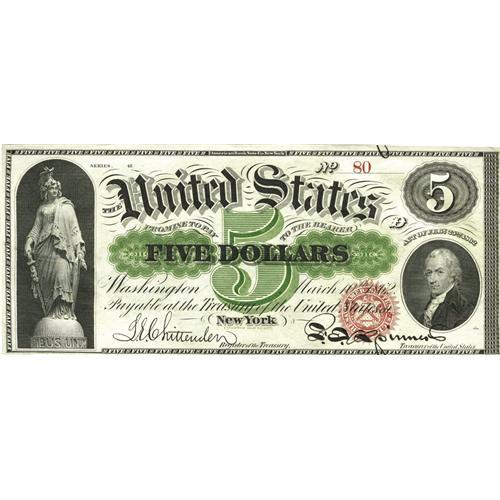 <B>Fr. 61a $5 1862 Legal Tender Choice New.</B></I> Spectacularly bright and perfection in every sense but for margin size. The margins come very close in a few places but remain clear of the frame line all the way around. As fresh and original as the day it was made and carrying the low serial number of 80. A couple of closed pinholes are seen on the back.