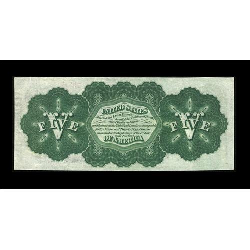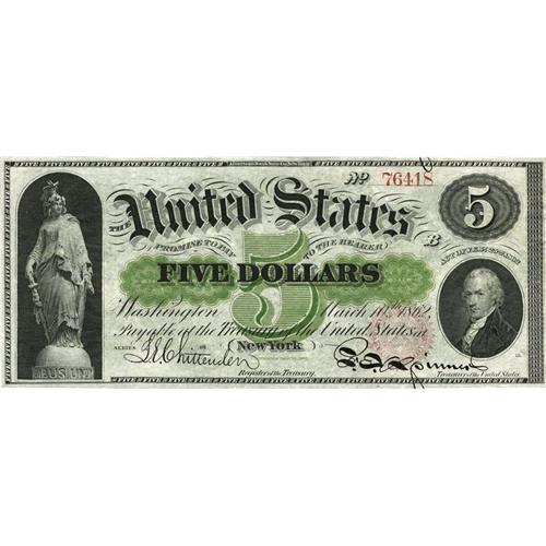 <B>Fr. 61a $5 1862 Legal Tender Choice New.</B></I> This is a strictly original $5 Legal Tender. Its serial number falls two notes away from another piece permanently impounded in the New York Federal Reserve Bank. Some as-made crinkles are noted at right and affect the grade. Were they not there, this adequately margined note would grade Gem.<BR><I>From The Plymouth Rock Collection</B></I>
