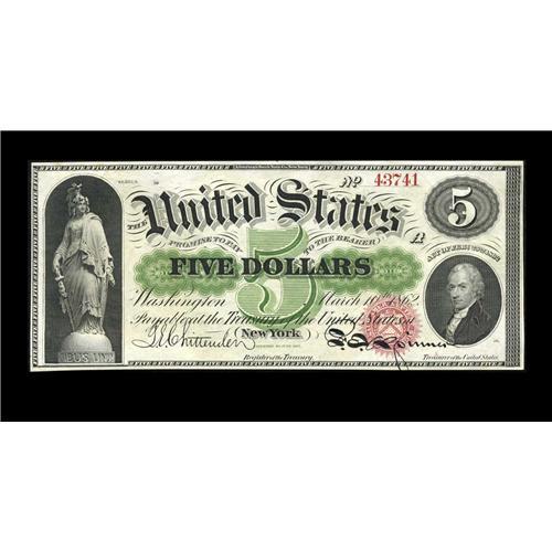 <B>Fr. 61a $5 1862 Legal Tender New.</B></I> The margins around this note are nicely cut. A bit too much handling and a paper clip wrinkle deny a higher grade while the paper still possesses much originality and snap. Expect this note to realize higher price levels than the grade assigned warrants.