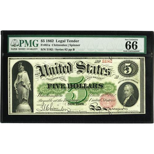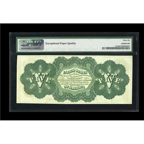 <B>Fr. 61a $5 1862 Legal Tender PMG Gem Uncirculated 66 EPQ.</B></I> This early Five which has flown under the census radar until tonight has absolutely ideal color, good margins for its type and original embossing that is easily seen through the third-party holder. It ranks as one of the nicest Fr. 61a's we have handled.