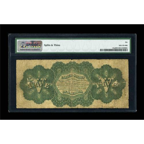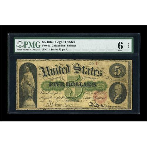 <B>Fr. 61a $5 1862 Legal Tender PMG Good Net 6.</B></I> There are nine serial number 1 notes in the census for this Friedberg number. Serial numbers on these notes went as high as five-digits, then the series increased by one and the serial numbers started over at 1.<BR><BR><b>Shipping:</b> Coins & Currency (<a target="_blank" href="http://www.heritageauctions.com/common/shipping.php">view shipping information</a>)
