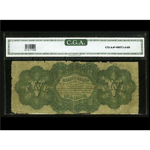 <B>Fr. 61a $5 1862 Legal Tender Serial # 1 CGA Good 6.</B></I> The edges are considerably worn, and in parts missing, on this serial # 1 Series 71 1862 Legal Tender.