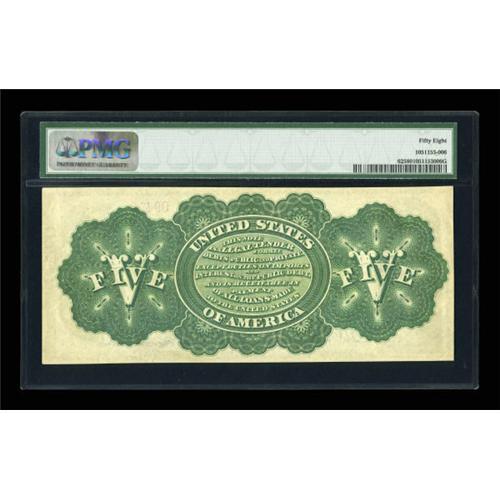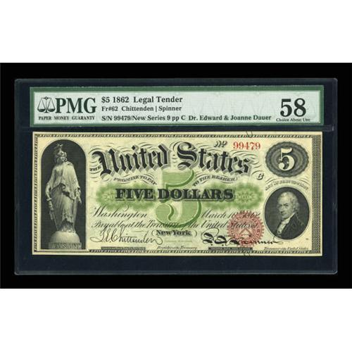 <B>Fr. 62 $5 1862 Legal Tender PMG Choice About Unc 58.</B></I> Fr. 62 is a much scarcer number of this relatively common design type. Only 50 examples are known of this variety, which has the Second Obligation back and the March 10, 1862 date. In spite of its AU grade, this piece is safely in the top ten examples. PMG has graded only this note at the 58 level with only four pieces higher. The type is illustrated on page 73 of the Dauers' book, although this is not the illustration piece. <BR><I>From The Dr. Edward & Joanne Dauer Collection</B></I><BR><BR><b>Shipping:</b> Coins & Currency (<a target="_blank" href="http://www.heritageauctions.com/common/shipping.php">view shipping information</a>)