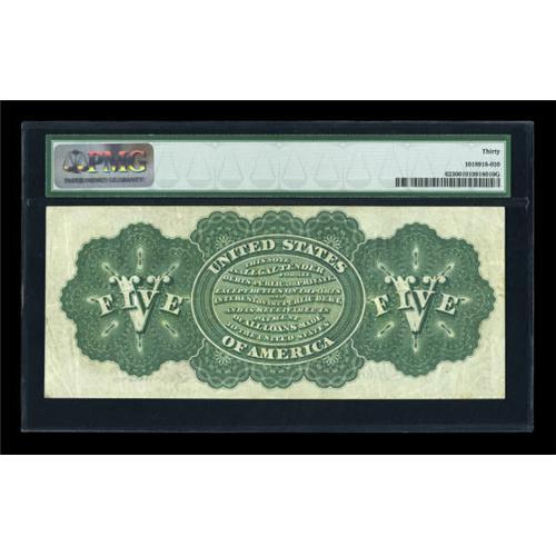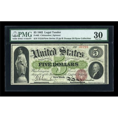<B>Fr. 62 $5 1862 Legal Tender PMG Very Fine 30.</B></I> The most recent Track & Price census shows 54 examples of this number. This is the scarcer type, where the second-obligation back combines with the 1862 date. The note has excellent color and far better margins than what we're used to for this issue.<BR><I>From The Thomas M. Flynn Collection</B></I><BR><BR><b>Shipping:</b> Coins & Currency (<a target="_blank" href="http://www.heritageauctions.com/common/shipping.php">view shipping information</a>)