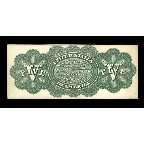 <B>Fr. 62 Hessler UNL $5 1862 Legal Tender Back Proof New.</B></I> Hessler does not list a back proof for this design, though a face proof was mentioned in a letter dated July 25, 1862 from the National Bank Note Co. to the Assistant Secretary of the Treasury. This face proof has not turned up since. The back proof offered here is printed on light card stock. Handling is restricted to a small corner fold and evidence along the bottom edge of once being possibly mounted. Also, right below the top edge is a trivial defect in the card stock before printing took place. Nonetheless, a historic proof that pre-dates the BEP.