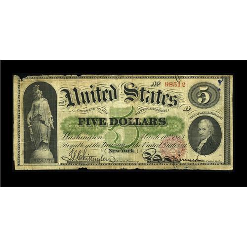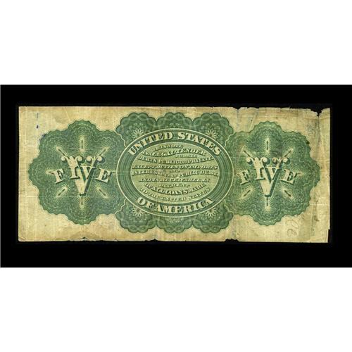 <B>Fr. 63 $5 1863 Legal Tender Good-Very Good.</B></I> Some paper frailty is noted and as such, some small pieces of paper in the margin are missing. This note is still an 1863 Legal Tender and features the wear consistent with the Fine grade.<BR><I>From The Plymouth Rock Collection</B></I>