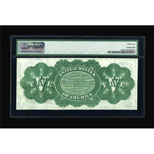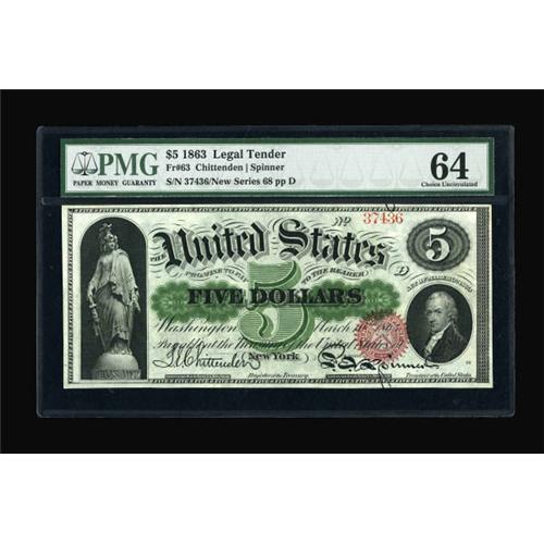 <B>Fr. 63 $5 1863 Legal Tender PMG Choice Uncirculated 64.</B></I> To date, PMG has only graded three 64's (including this note) with only three notes grading higher. This is a great example for the type. The margins are more than adequate all the way around. The colors brilliantly shine through the third party holder, and the design intricacies on both the front and back remain utterly unmolested. The note appears to us as though it easily could have been awarded another point or two. There are two natural wood chips in the note at the left. Either or both could have been mistaken for light stains at a glance, and they could possibly account for the 64 grade and the lack of the EPQ comment.<BR><BR><b>Shipping:</b> Coins & Currency (<a target="_blank" href="http://www.heritageauctions.com/common/shipping.php">view shipping information</a>)