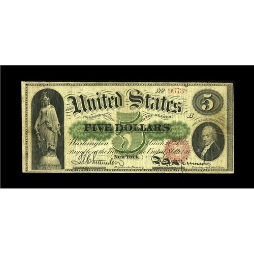 <B>Fr. 63a $5 1863 Legal Tender Fine.</B></I> The inks are dark while the uniform circulation only adds to the appeal of this $5. A few minor edge splits are observed, but nothing uncommon for the assigned grade.<BR><BR><b>Shipping:</b> Coin/Currency (<a target="_blank" href="http://www.heritageauctions.com/common/shipping.php">view shipping information</a>)