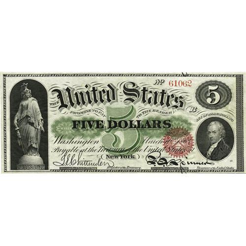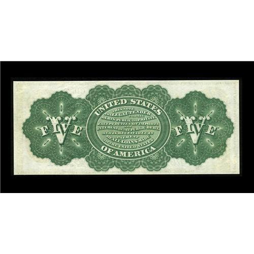 <B>Fr. 63a $5 1863 Legal Tender Gem New.</B></I> Unlike so many uncirculated examples of this type, this note boasts broad margins and perfectly original paper quality. This piece completely avoided any grade limiting attributes and is untoned. A couple as-made crinkles and a slightly smaller bottom margins limit this from a full Superb grade.<BR><I>From The Plymouth Rock Collection</B></I>