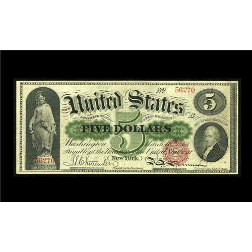 <B>Fr. 63a $5 1863 Legal Tender Very Fine-Extremely Fine.</B></I> This nice circulated note displays exceptionally vivid and strong color contrast, with a deep red seal and is particularly enhanced by the atypically even and well balanced centering. The oft brittle paper on this issue does have two unobtrusive margin splits, one at top right and the other and bottom left, but both could easily be dealt with by skilled professional restoration. This is precisely the kind of note whose extraordinary aesthetic appeal will likely carry it beyond the price levels its technical grade might lead one to predict. The successful bidder will regard our estimate merely as a starting point.