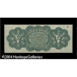 Fr. 63b $5 1863 Legal Tender Extremely Fine-About New. <B>Fr. 63b $5 1863 Legal Tender Extremely Fine-About New.</B></I> The note has a few very light folds, and its only distraction is a small, but dark brown spot at the upper right of the back that shows through to the face. Bold ink colors and bright paper along with near-perfect centering more than make up for the one trifling defect.<BR><I>From the collection of Malcolm A. Trask.</B></I> <BR><BR><B>Important notice:</B> Heritage usually auctions material at the rate of 200-250 lots per hour. On some occasions eBay Live bid software or the Internet may not be able to keep up with the pace of the auction. We recommend placing a realistic absentee bid now as insurance to avoid disappointment. Occasionally the auctioneer may eliminate or reject an eBay Live bid, and the auctioneer may also reopen a lot after the close of the eBay live bidding (usually because we missed an audience bid), and may reject your bid even if it shows you as the winning bidder. By bidding via eBay Live, you agree that Heritage may award the lot to another bidder at its sole discretion under the circumstances described above or any other reasonable circumstances. Since eBay bids are not shown to us until we open the lot on the floor, we treat those bids just like floor bids. In most cases the floor responds before the eBay bid is presented to us, due to Internet lag time, so for consistency we have made it a policy that floor bids are always considered first over tie eBay live bids. Also please note that all Heritage lots purchased through eBay Live carry a 20% Buyer's Premium. Please make sure you read the Terms and Conditions before you bid. This lot is being auctioned in conjunction with a live floor auction by Heritage Galleries & Auctioneers. All final auction and invoice information will be supplied by Heritage Galleries & Auctioneers, and all other information should be considered preliminary. Lot:16863