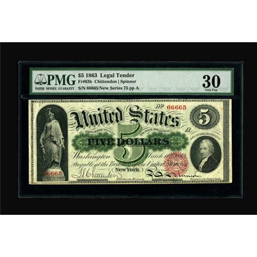 <B>Fr. 63b $5 1863 Legal Tender PMG Very Fine 30.</B></I> Almost solid sixes on this bright, multi-folded note.<BR><BR><b>Shipping:</b> Coins & Currency (<a target="_blank" href="http://www.heritageauctions.com/common/shipping.php">view shipping information</a>)