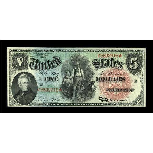 <B>Fr. 64 $5 1869 Legal Tender Choice About New.</B></I> A soft center fold is the only circulation this piece has sustained. Bright and crisp with some embossing seen.<BR><BR><b>Shipping:</b> Coins & Currency (<a target="_blank" href="http://www.heritageauctions.com/common/shipping.php">view shipping information</a>)