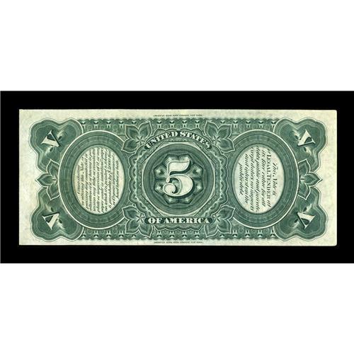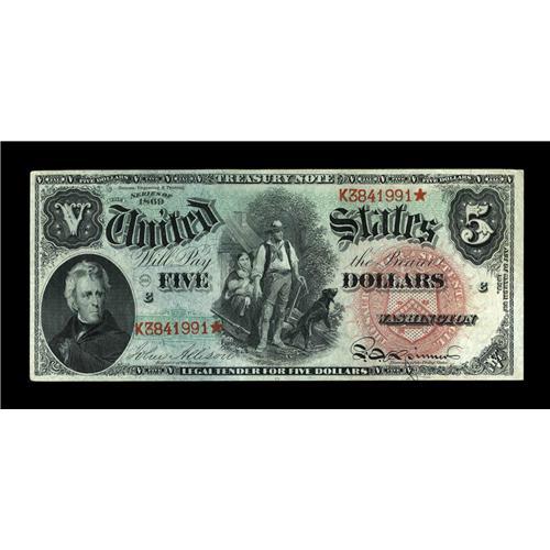 <B>Fr. 64 $5 1869 Legal Tender Choice About New.</B></I> The embossing is simply stupendous and the blue end deeply colored. A beautiful, well centered example of the popular "Rainbow" type, this piece is limited in grade by a few minor signs of handling, including a bent corner tip in the lower left corner.<BR><BR><b>Shipping:</b> Coin/Currency (<a target="_blank" href="http://www.heritageauctions.com/common/shipping.php">view shipping information</a>)