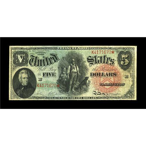 <B>Fr. 64 $5 1869 Legal Tender Fine.</B></I> This Rainbow $5 Woodchopper has good margins and color with a few pinholes.<BR><I>From The Collection of Greg Southward</B></I><BR><BR><b>Shipping:</b> Coins & Currency (<a target="_blank" href="http://www.heritageauctions.com/common/shipping.php">view shipping information</a>)