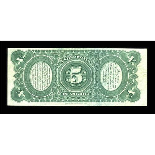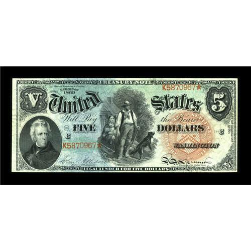 <B>Fr. 64 $5 1869 Legal Tender New.</B></I> The note has the appearance of a fully Choice Example, but unfortunately, a small V-shaped piece has been replaced in the top margin. It's not at all conspicuous, and this note will afford some collector the opportunity to spend less than $2000 on a note that looks like a $5000 piece.<BR><I>From The Jacob and Heather Dedman Collection</B></I><BR><BR><b>Shipping:</b> Coins & Currency (<a target="_blank" href="http://www.heritageauctions.com/common/shipping.php">view shipping information</a>)