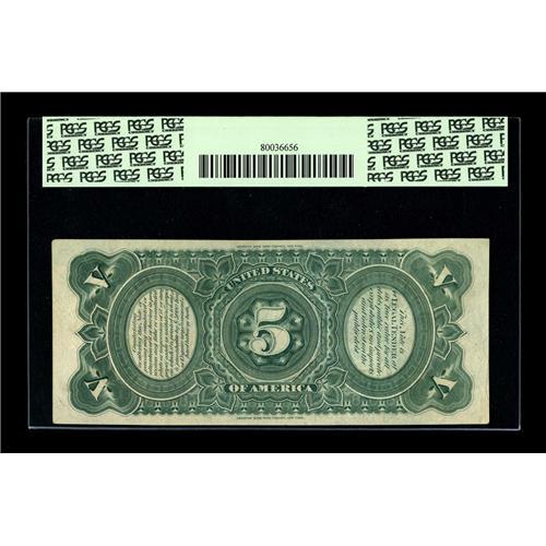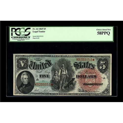<B>Fr. 64 $5 1869 Legal Tender PCGS Choice About New 58PPQ.</B></I> A boldly colored, Rainbow Pioneer Five that falls just short of the fully Uncirculated grade.<BR><I>From The Bill and Kathy Stella Currency Collection</B></I><BR><BR><b>Shipping:</b> Coin/Currency (<a target="_blank" href="http://www.heritageauctions.com/common/shipping.php">view shipping information</a>)
