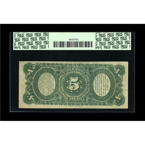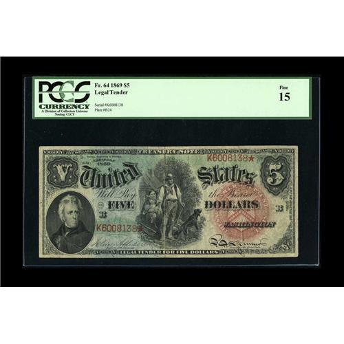 <B>Fr. 64 $5 1869 Legal Tender PCGS Fine 15.</B></I> Those wishing to begin a set of circulated Rainbows should consider this example. Only a single pinhole is noted through the holder.