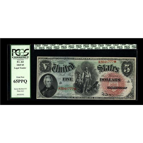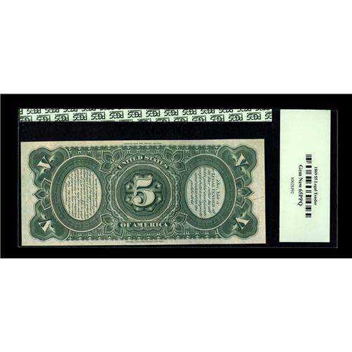 <B>Fr. 64 $5 1869 Legal Tender PCGS Gem New 65PPQ.</B></I> Two other notes from this sheet have been seen at public auction, but we doubt the others are as nice as this Gem. A real knockout of a note with super colors and a dark blue security stain that commences at the top and runs fully down to the bottom margin.<BR><BR><b>Shipping:</b> Coin/Currency (<a target="_blank" href="http://www.heritageauctions.com/common/shipping.php">view shipping information</a>)