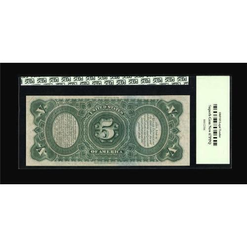 <B>Fr. 64 $5 1869 Legal Tender PCGS Superb Gem New 67PPQ.</B></I> The colors are striking on this Rainbow Pioneer Family Five. PCGS has not yet released its population report, but we expect the numbers to be roughly comparable to PMG. PMG has graded over 100 Fr. 64s with only a single 67, a handful of 66s, and twenty-three 65s. Whatever the PCGS numbers are, it is a certainty that Fr. 64s in 67 grade will never be anything but rare. Beautifully margined, fresh, and clearly original.<BR><BR><b>Shipping:</b> Coins & Currency (<a target="_blank" href="http://www.heritageauctions.com/common/shipping.php">view shipping information</a>)
