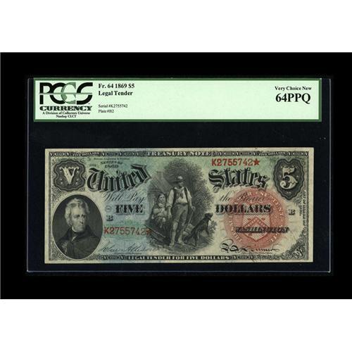 <B>Fr. 64 $5 1869 Legal Tender PCGS Very Choice New 64PPQ.</B></I> This note is almost at the gem level with plenty of margin surrounding it and overall nice surfaces.