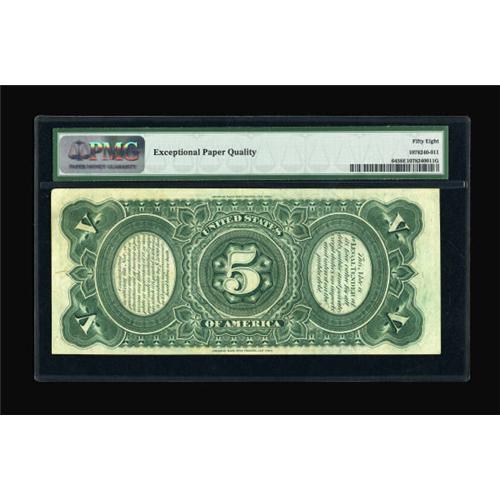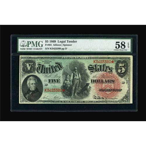 <B>Fr. 64 $5 1869 Legal Tender PMG Choice About Unc 58 EPQ.</B></I> A soft, broad corner fold seems to be the reason this lovely and deeply inked Rainbow $5 was assigned the grade. If fresh, original material is what you seek, this is the note for you.<B><BR></B></I><I>From The Warren Marshall Collection</B></I><BR><BR><b>Shipping:</b> Coins & Currency (<a target="_blank" href="http://www.heritageauctions.com/common/shipping.php">view shipping information</a>)